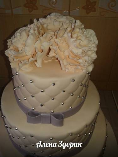 Свадебный 3-х ярусный торт цвета айвори с пионами, стеганными боками с серебристыми бусинками